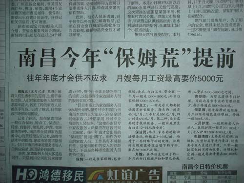 記者了解到,現在家政市場一般包含保姆、鐘點工、保潔員、月嫂、育嬰師、催乳師、護理、電器清洗等8種。南昌市金保姆家政服務中心的黃經理告訴記者,隨著生活水平的提高,家政市場需求量很大。但目前南昌市家政服務市場人員供應偏緊,原因是多方面的。